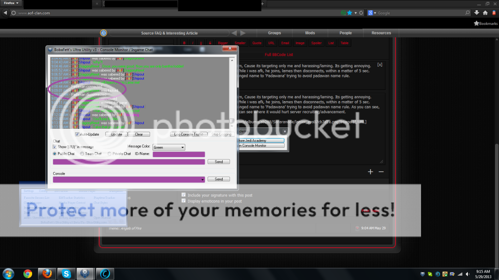 This is becoming quite a problem, Cause its targeting only me and harassing/laming. Its getting annoying. Heres the Screen-cap image. While i was afk, he joins, lames then disconnects, within a matter of 5 sec. 'Padawan' is his name even changed name to 'Padawana' trying to avoid padawan name rule. As you can see, if people are treated this way I can see where it would hurt server recruiting/advancement. Image 1 Image 1: Shows the above passage ive written. Image 2 Image 2 shows him coming back for a period of 1 to 1 1/2 Minutes. then leaving hoping to lame again. Thanks for your time. |
