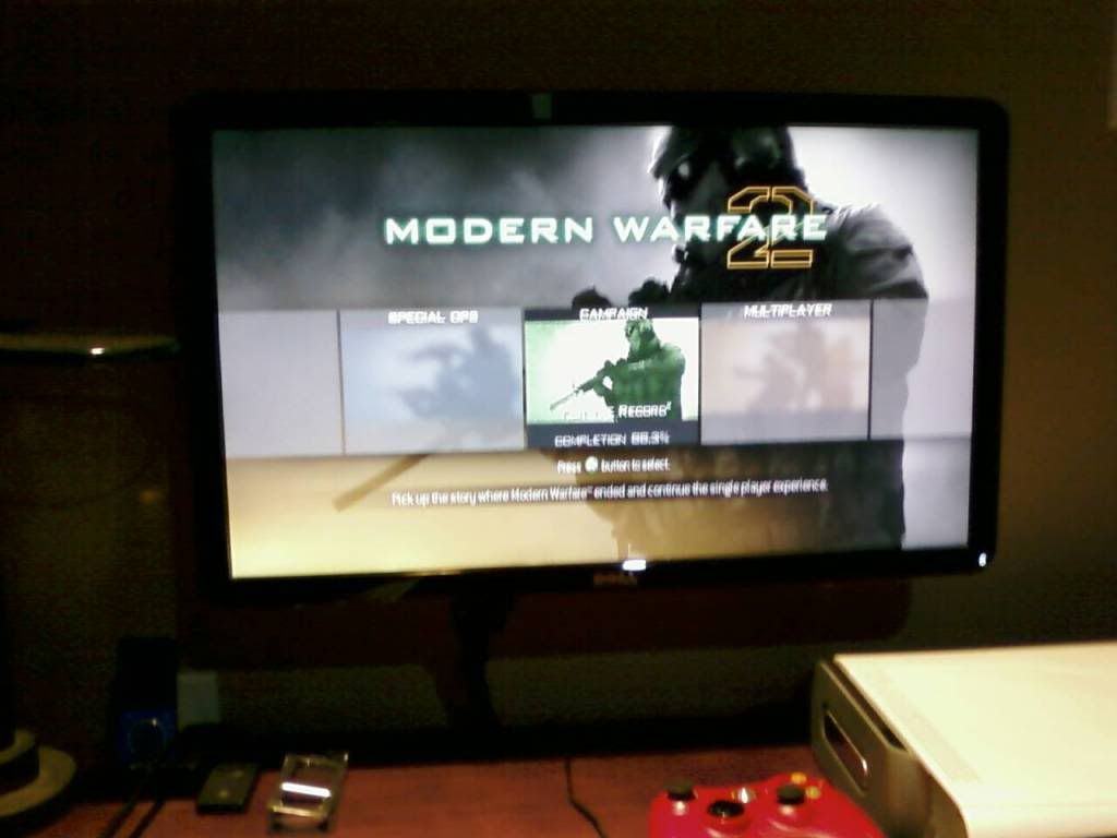 My Dell 24" 1080P computer monitor that doubles as my Xbox screen. My family's 42" 720P LCD Vizio TV. Yeah sure it's not 1080P, but it still looks great. EDIT: Wow, my bad, my camera on my phone SUCKS. Edited by smoothz, Nov 23 2009, 08:43 PM.