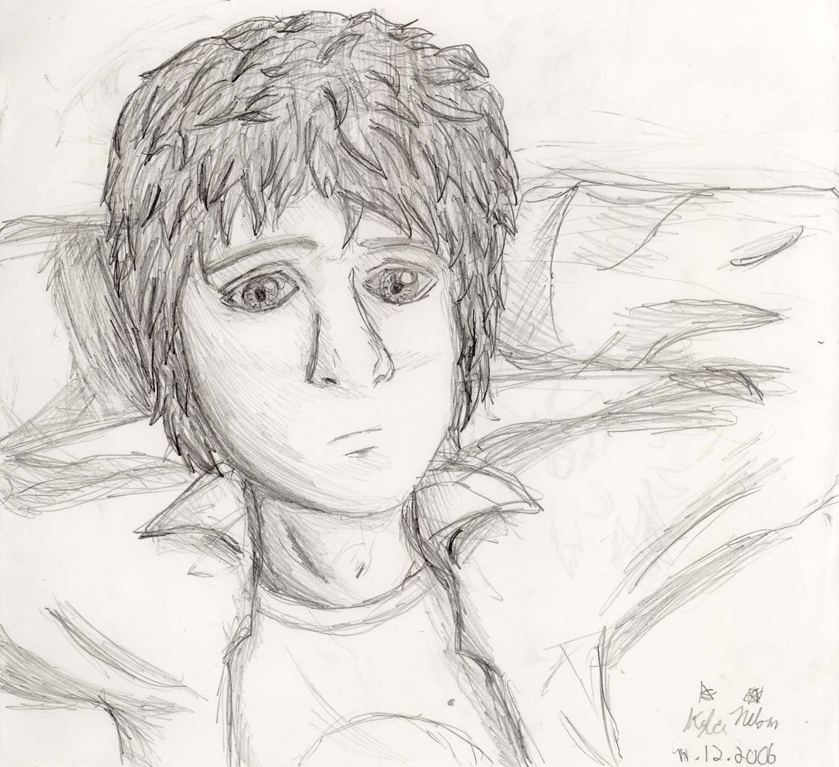 =P anyway- got some sketchy's to show you dat i'ma rather pleased with.. for once their dated and.. youg et a glimpse of m hadriting at a.. relatively decent level, beleive it or not. Just a self-portrait i know the head is big.. this one i actually rather like; and .. originally the eyes were all screwed up.. i fixed that today and it looks loads better.. it's also recognisable ME, too. weird. Drew-- light scan Friend of mine, Drew You migta heard me go off on few-second tangents abotu him? it's really weird.. i've had dreams with him in 'em like, the last three nights.. *scared* anyway- again the big head thing. you know, that hands-behind-the-head pose thing is HARD. and the eyes look kinda wonky, but eyes never want to line up anyway. depending on your monitor, this one's robably closest to what the actual picture looks like.. but it doesn;t get all eh detail OR the shading effects i wanted. @anyone who knows or has seen a picture of drew: his hair doesn;t seem poofy egnough. am i on crack or what? You know, the scary thing is it actually kinda looks like him; i had almost o reference except for a few times i had to glance back fourth period to figure out how the heck his hair fell. Drew - Sharp Scan same picture- you can see the hair detail better. To Catch a Drop of Rain I actually like the concept for this one; i need to re-do it. abotu the upside down .. smiley guy thing in the corbner.. i was using hat paper that reacts to heat, and i happened to have a candle nearby when i was finishing this one up. this is like, majorly a scetch, i know it, so it's not all that good, nor is it really meant to be. .. cough* and i know, the big head thing. workingon it. anyway.. critique? |